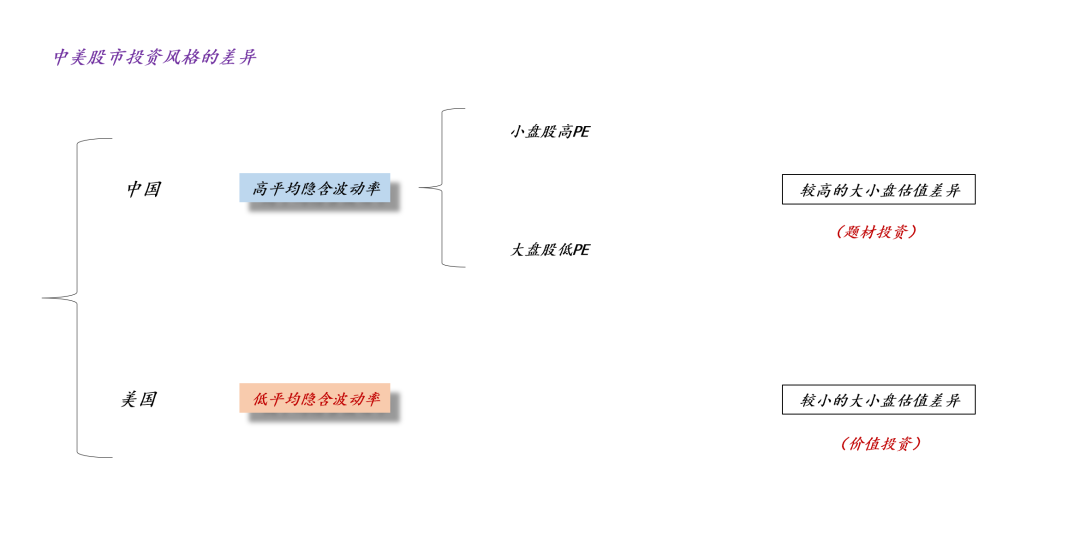 其基本结论是,中国的制度设计(ps:尤其是T+1制度和缺乏现券做空机制)使得中国股市的平均隐含波动率显著地高于美股。这导致了一个现象:中国股市存在较高的大小盘估值差异,但是,美股的大小盘估值差异较小。于是,A股流行题材投资,美股流行价值投资。