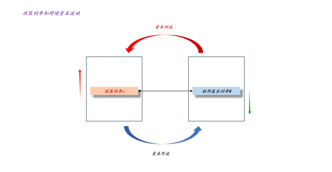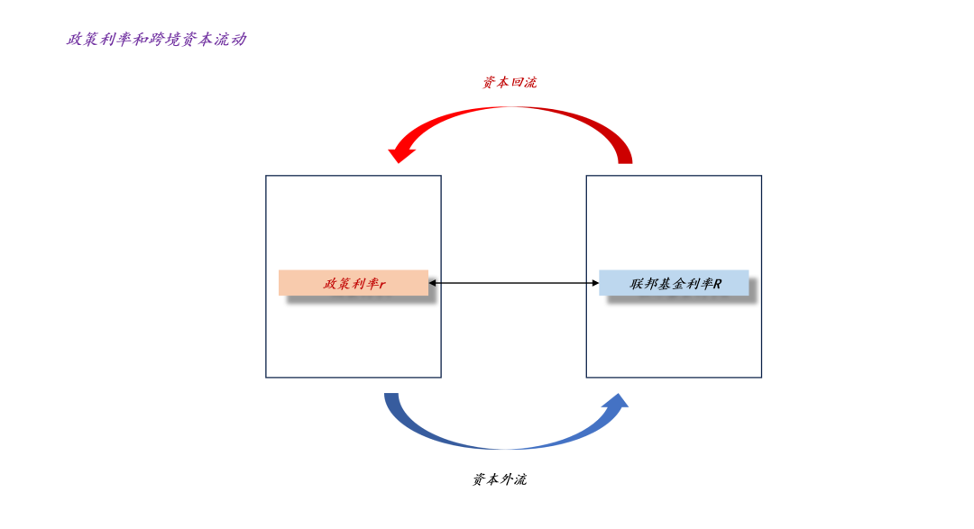 如上图所示,引起跨境资本流动的原因,既可以是本国的政策利率r发生变动,也可以是对岸的联邦基金利率R发生变动。