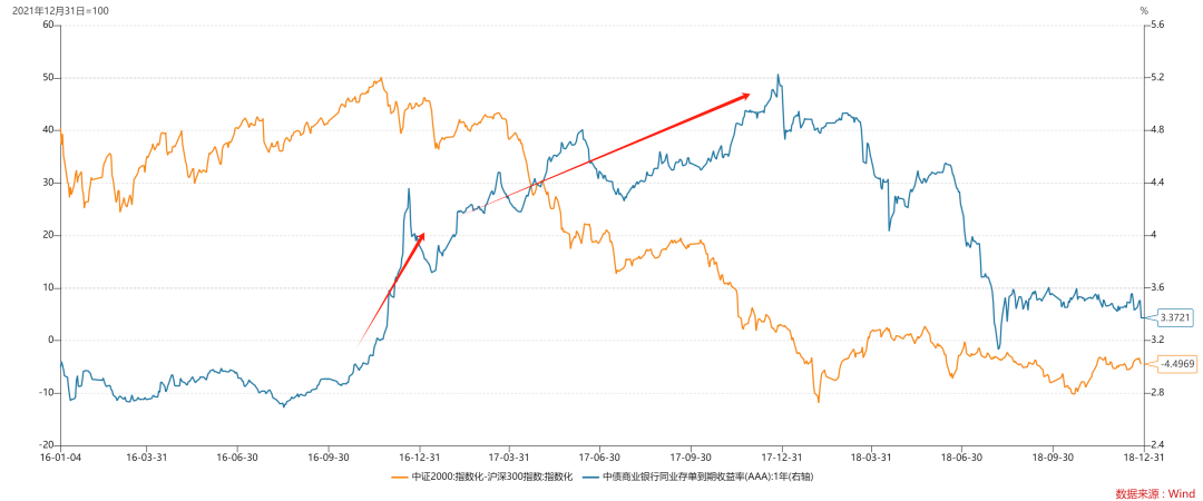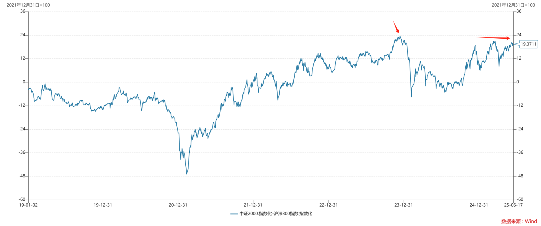 有趣的是,在2017年股票市场风格剧烈变化,大小盘估值差异从高点的50%大幅回落至低点的-10%(ps:以2021年12月31日为基期,分别把中证2000和沪深300的点位标准化为100,并计算二者的差额)。
