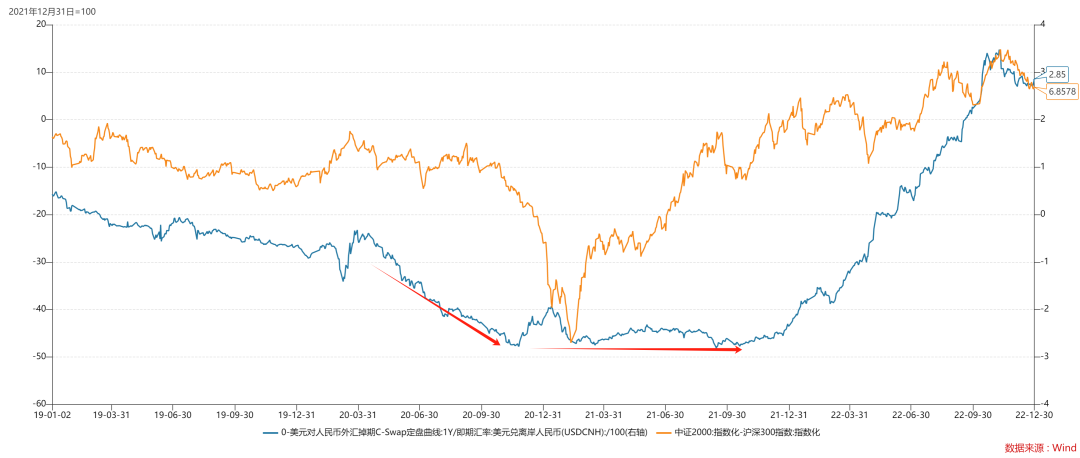 如上图所示,疫情之后,美联储把联邦基金利率降低至零,于是,人民币对美元的掉期收益率转为负值,且负值程度持续扩大,最低来到了-2.7%附近。这意味着,境内遭遇很大的美元流入压力。相应的,在2020年股票市场风格也剧烈变化,大小盘估值差异从高点的0%附近大幅回落至低点的-47%(ps:以2021年12月31日为基期,分别把中证2000和沪深300的点位标准化为100,并计算二者的差额)。
