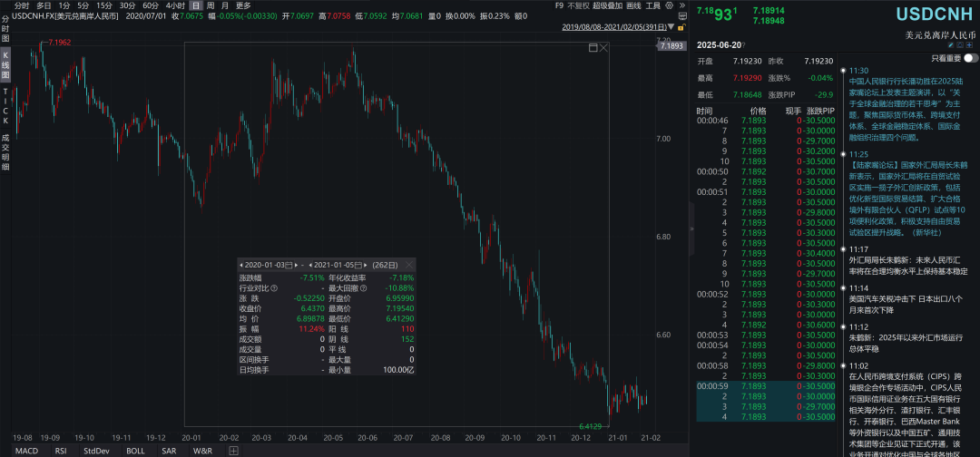 如上图所示,在2020年初至2021年初人民币对美元差不多升值了7.51%。