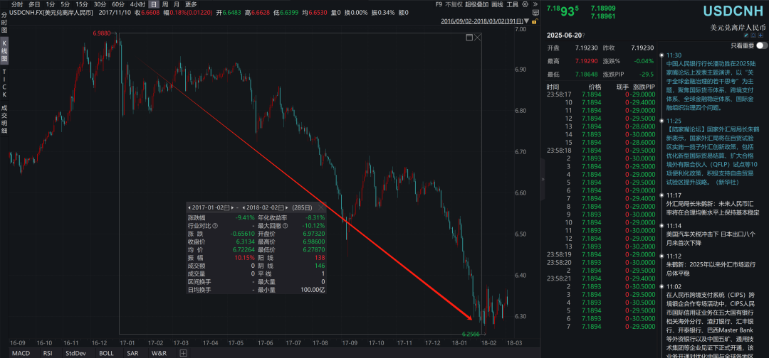 如上图所示,在2017年初至2018年2月人民币对美元差不多升值了9.4%。