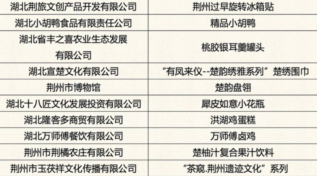 “有凤来仪——楚韵绣雅系列”楚绣围巾、楚韵盘翎、犀皮如意小花瓶、荆州过早旋转冰箱贴、精品小胡鸭、桃胶银耳羹罐头、洪湖鸡蛋糕、万师傅卤鸡、楚柚汁复合果汁饮料、茶窥。荆州遗迹文化系列。